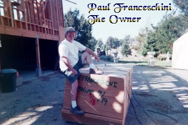 We live in the country but very close to town. Since we can see our neighbors, the Missouri family members don't think we are in the country but for California, trust me, we are in the country. Anyway, since photos are expensive, we decided to install this web site so family members can keep abreast of all that is happening with us. As of August 30, 2001 we are sitting on a roll of film with more progress to the garage. No one seems to find the time to drop them off to the developers but we keep saying we will. ;-] We have the foundation all in, and we have the garage just about sticked. Sticked means the walls and roof skelton are just about in. We are close to hiring roofers and the stucco people. We expect to be closed in by the end of December. Then we start on the inside work. Plumbing, insulation, wiring, ect. This is a personal web page and is not a company. Email The Franceschinis (Paul and Alice) with any comments or questions you might have.